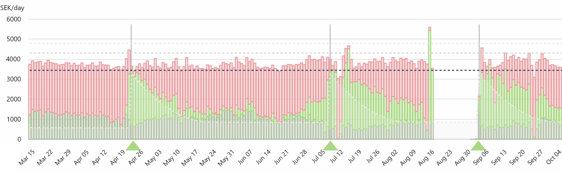 Each clean-up increased profitability by 2,663 SEK – 3,733 SEK per day. The payback times for the clean-up costs were less than two days for each clean-up. With these three clean-ups our client has already made 164,952 SEK more profits between April 21st and October 5th.