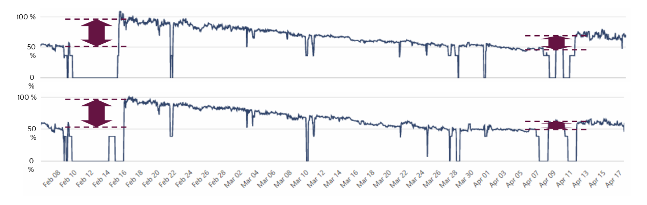 After taking a sample from the heat exchangers, our cleaning partner designed a cleaning formula from a combination of chemicals, temperatures, and circulation times. After applying the new formula during CIP-cleaning, the hardened sediment had softened and started to move. HeatHamster data confirmed this, but the data indicated that the power rating dropped to 2.5 MW again shortly after.