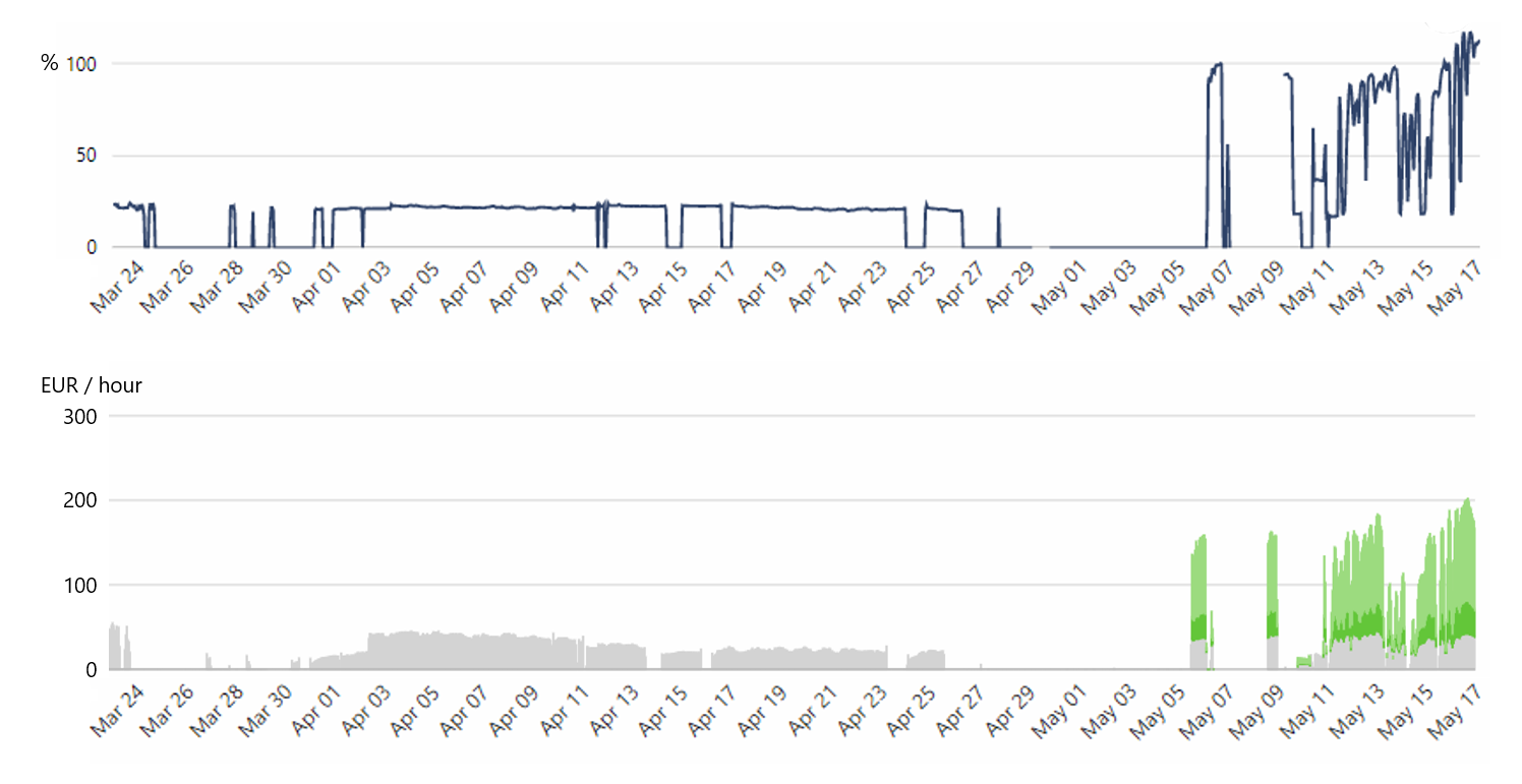 The power increase of 6.6 MW equals a total of 3,960€ of profit savings per day. The profitability difference between the old and the new intelligent cleaning method is 3,360€ per day.